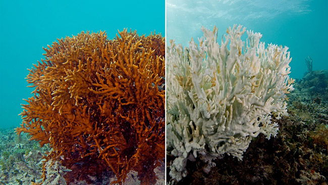 珊瑚白化前(左)及後(右)比較。